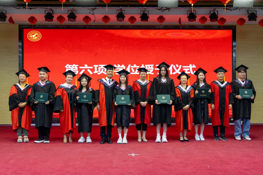学院为同学们准备了甜点和水果,王斌宁为同学们分切蛋糕,与学院毕业生及家长共同分享毕业时刻的甜蜜与喜悦。随后,全体学生庄严宣誓,学位授予仪式正式开始。在庄重而热烈的氛围中,学位委员会的导师们为毕业生一一拨正流苏、颁授学位证书。这一刻,毕业生们的脸上洋溢着激动和自豪的笑容,他们纷纷与导师们合影留念,记录下这一难忘的时刻。