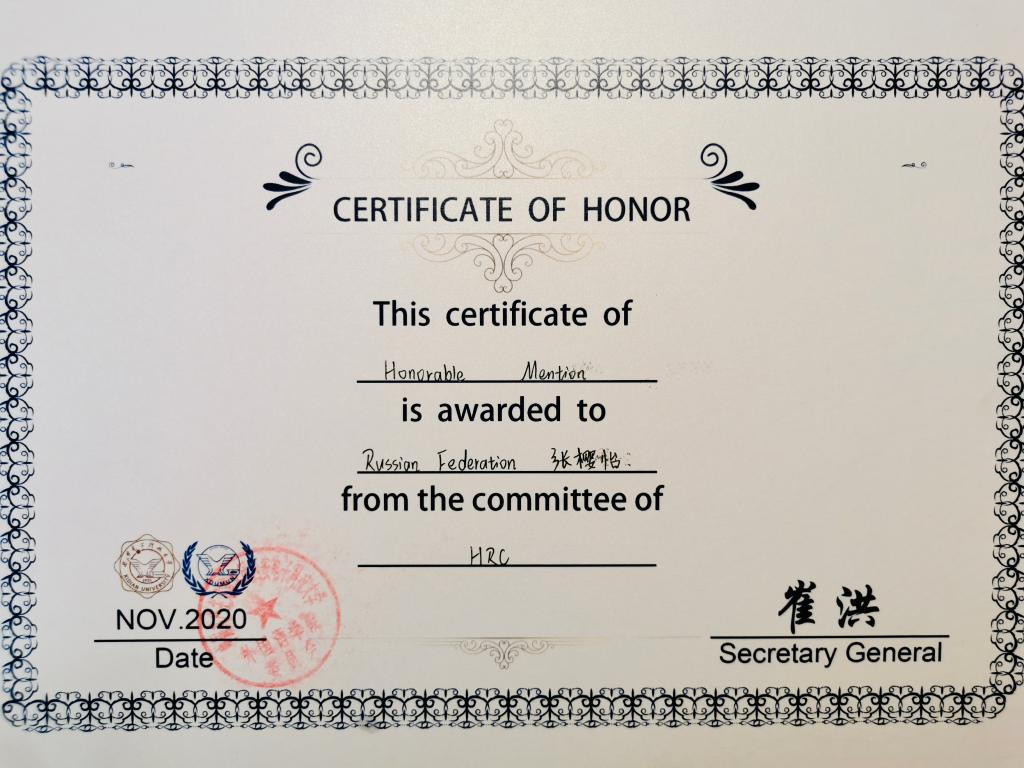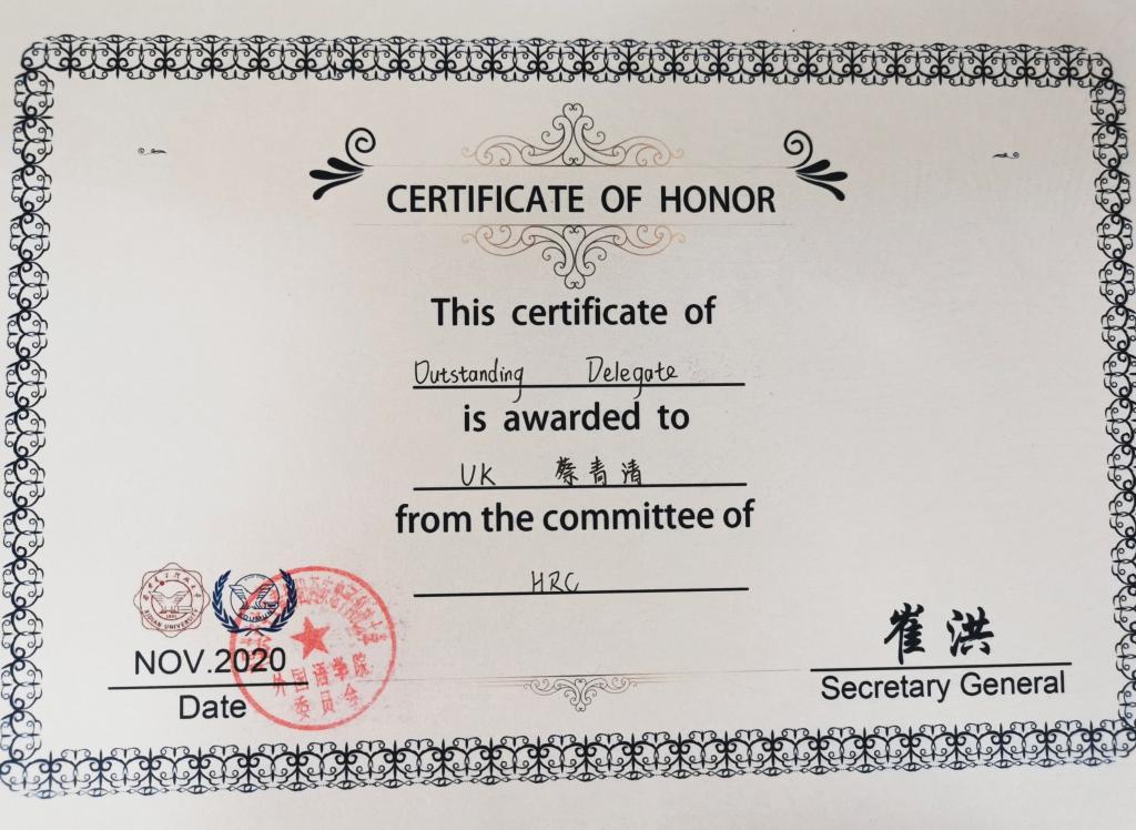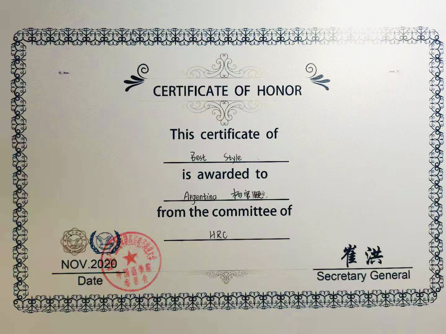 2020年11月13日至11月15日,威尼斯官网模拟联合国团队共派出七名代表参西安电子科技大学第十一届模拟联合国大会,斩获个人奖三项,分别是最佳风格奖(Best Style)——杨官凝,杰出代表奖(Outstanding Delegate)——蔡青清,以及荣誉提名奖(Honorable Mention)——张樱怡。
