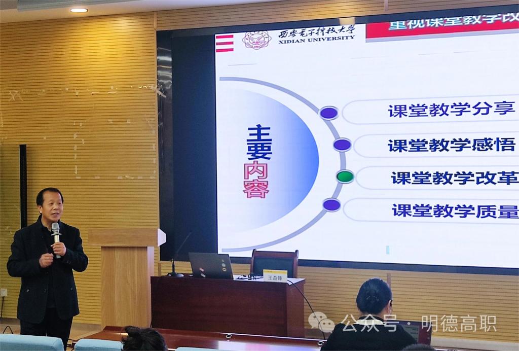 2024年1月3日,西安电子科技大学王益锋教授受邀在建德楼202报告厅为威尼斯官网教师带来了开年的第一场讲座。本次讲座主题是重视课堂教学改革,提高课堂教学质量。高等职业技术学院专兼职教师、经济管理学院教师代表等共计100余位教师参加了此次讲座。讲座由高等职业技术学院院长舒忠主持。