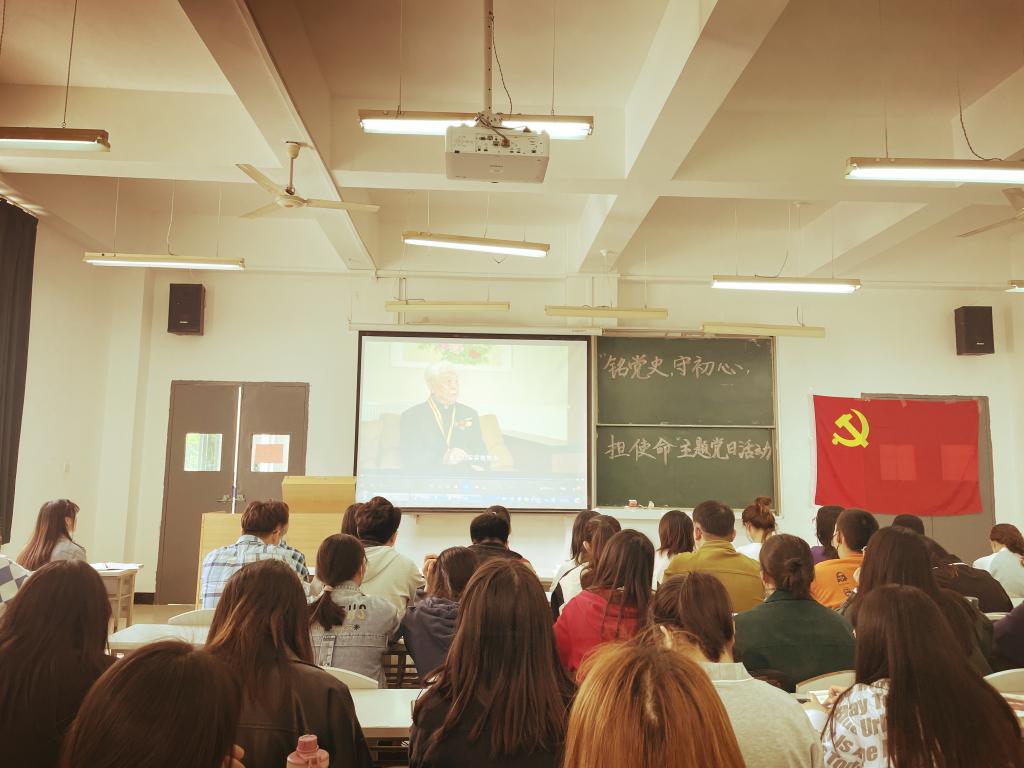 活动开始后,全体党员起立,奏唱国歌。罗夫惠同志传达了中宣部党史学习教育动员大会会议精神及党史学习教育意义。共同观看《党的光辉历程》、党史微党课《联合国合法席位的恢复》以及“芳华青春 峥嵘岁月”系列纪录片《抗战老战士口述实录:郭殿一》。讨论环节中,大家踊跃发言,学生第二党支部书记许柔同志在发言中讲到,正值中国共产党成立100周年,学生党员要主动发挥党员模范带头作用,积极做好党史学习教育宣传工作,拉好弓,开好局。张孝威同志谈到,青年一代有理想有抱负,唯有铭记历史,才能始终不忘初心,勇担使命。
