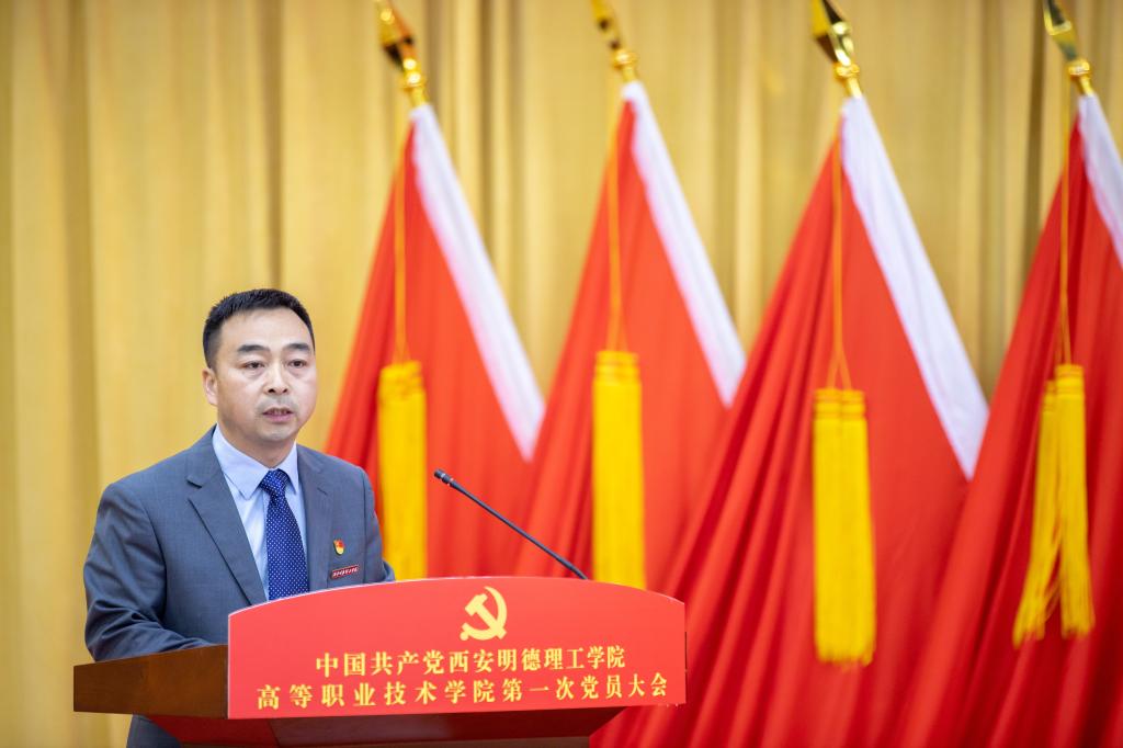 大会在庄严的国歌声中开幕。高等职业技术学院院长舒忠对大会的顺利召开表示热烈的祝贺!他在致辞中回顾了学院自成立以来取得的显著的成绩,。分享了学院未来发展的蓝图构想和面临的新机遇新挑战,号召全院党员要以此次党员大会为新征程,积极作为、踔厉奋发,不忘立德树人初心,牢记为党育人、为国育才使命,同心同力,同向同行,积极推进学院高质量向前发展。