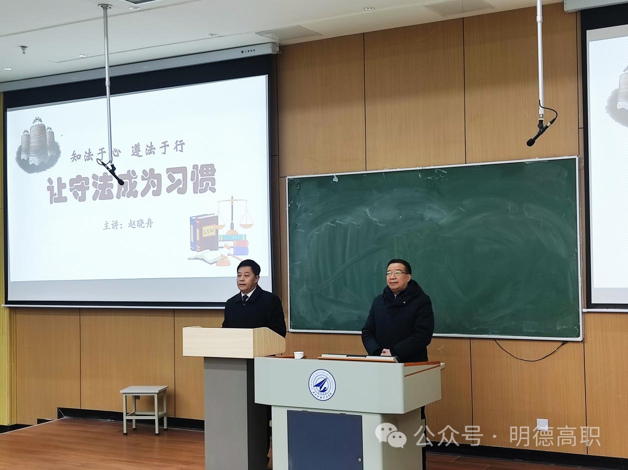 期末将至,又值佳节来临,近期已进入电信诈骗高发期。为切实提高学生反诈骗能力,12月27日我院特邀请西北政法大学赵晓舟教授在7号楼102教室为我院师生带来“知法于心、违法于行、让守法成为习惯”的专题讲座。讲座由高等职业技术学院院长舒忠主持。