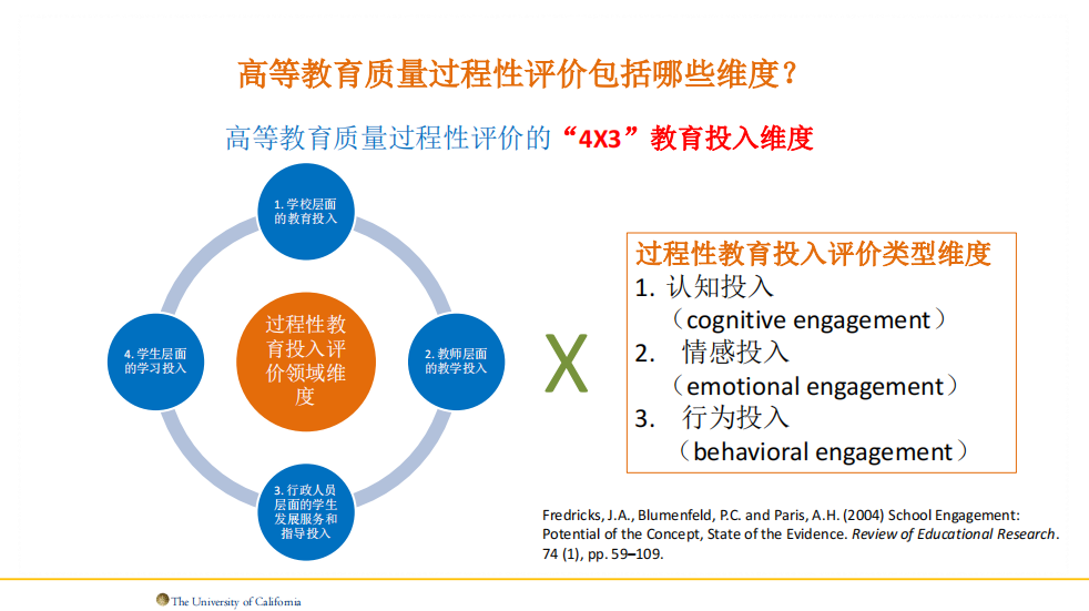 朱文庆教授表示:过程评价的本质是分析项目实施成效、解决问题的评价,过程输入信息是原因变量,而成果的达成度是结果变量,因此是一种“因果推断”评价。对于高等教育质量过程性评价,实际上是对参与教育的全体成员和涉及教育全过程的评价,只有当教育质量评价与“人”的认知、情感、行为评价有机结合起来,才能深刻刨析“过程”的“因”,才能更好的利用“评价结果”进行教育教学质量改进。