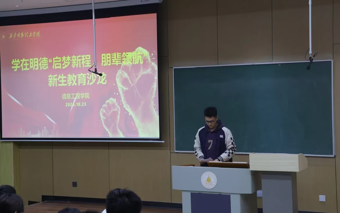 为落实新生教育相关要求,帮助2024级新生做好学业生涯规划,明确大学目标,同时进一步发挥朋辈榜样力量,引导同学们在经验交流和学思践悟中收获成长。2024年10月23日,信息工程学院在八号楼202教室成功举办“启梦新程,朋辈领航”教育沙龙活动。此次活动邀请学校优秀大学生报告团成员、国赛获奖学生、优秀退伍学生为2024级新生进行专题分享,活动由黄嘉明主持。