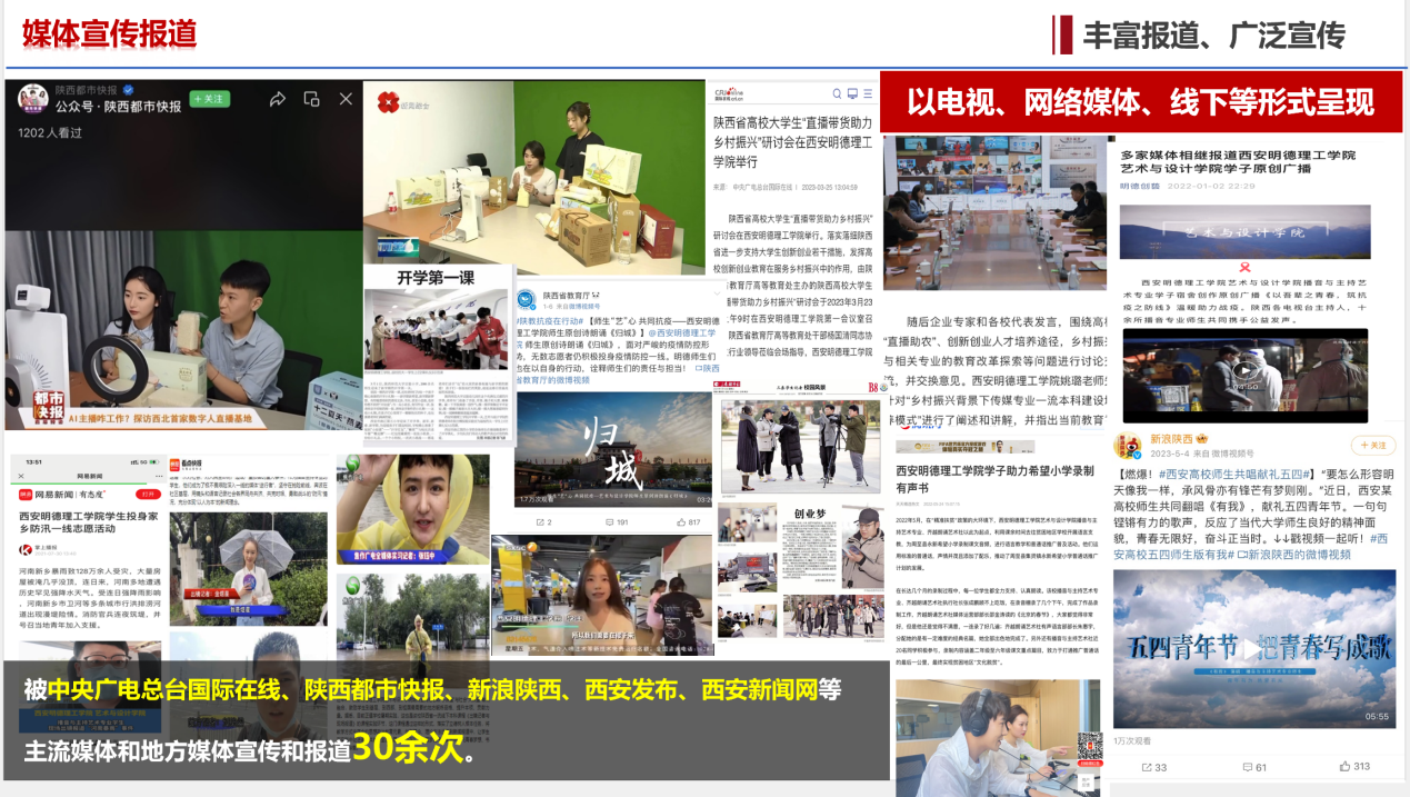 师生团队着力为合阳县推介“方寨红”樱桃、贵丝贝小米锅巴、香水莲花茶、金银花、粗布等产品进行直播带货。以及制作了百集系列短视频《走进乡村·看见中国》系列节目,学生在发挥专业特长开展面对面帮扶的同时,也担当起乡村文化、乡村产业、乡村旅游和乡村环保的传播者,直观展现了新时代大学生讲好乡村故事、助力乡村振兴的新生力量。